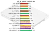 ????泡泡網(wǎng)固態(tài)硬盤SSD頻道6月25日?傳統(tǒng)的機(jī)械硬盤市場被去年東南亞的一場大洪水搞得一塌糊涂,黑心的代理商們借機(jī)提價(jià)大賺了一筆。于此同時(shí),不受洪水影響的SSD售價(jià)卻在不斷的下降之中。國外同行The Tech Report整理出了一份表格,顯示了一些品牌SSD近一年的價(jià)格變化,得出來的結(jié)果非常驚人,部分SSD的售價(jià)居然下降了接近50%%,這其中不乏海盜船、OCZ等一線品牌。 ??? 從表格