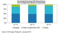 ????泡泡網(wǎng)硬盤頻道1月5日?西部數(shù)據(jù)已經(jīng)在消費級硬盤上穩(wěn)超希捷,但企業(yè)級領(lǐng)域還是不如后者,不過市調(diào)機構(gòu)IHS iSuppli預(yù)計,憑借旗下日立的充氦硬盤技術(shù),西數(shù)終將在企業(yè)級硬盤市場上也滅掉希捷。 ??? 算上日立,西數(shù)2012年第三季度在企業(yè)級硬盤市場上的份額已經(jīng)達到45%,只比希捷少3個百分點,而在引入充氦硬盤上,西數(shù)有望到2013年第四季度超越希捷。 ??? IHS分析師Fang