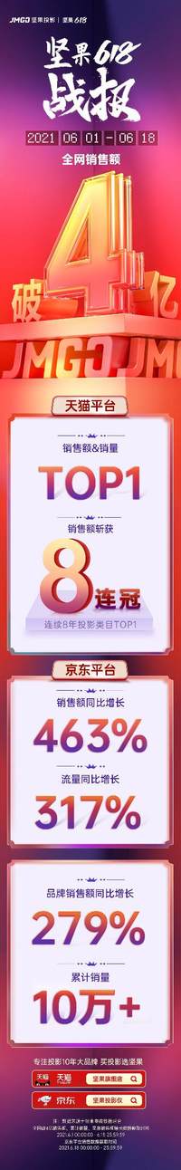618大促剛剛落下帷幕,作為智能家用投影行業(yè)龍頭企業(yè),JMGO堅(jiān)果投影618戰(zhàn)報(bào)顯示,在天貓平臺(tái)上,堅(jiān)果投影持續(xù)領(lǐng)跑高速增長(zhǎng)、一舉斬獲銷(xiāo)售額及銷(xiāo)量TOP1,連續(xù)8年穩(wěn)居投影類(lèi)目榜首;京東平臺(tái)銷(xiāo)售額同比增長(zhǎng)463%%,流量同比增長(zhǎng)317%%,全平臺(tái)品牌銷(xiāo)售額同比增長(zhǎng)279%%,累計(jì)銷(xiāo)量破100,000+。