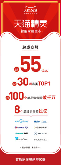 天貓精靈618購物節(jié)戰(zhàn)報(bào)顯示,截止6月18日24時(shí),天貓精靈及智能家居生態(tài)總成交額超55億元,其AIoT平臺孵化出30項(xiàng)品類TOP1,超過100個(gè)單品銷售額破千萬,8個(gè)品牌銷售額過億,成為全行業(yè)最具規(guī)模的智能家居爆款孵化器。