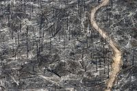 森林大火后的景象,據(jù)稱大火是由當(dāng)?shù)剞r(nóng)民和牧場主所放。2008年8月攝于巴西馬托格羅索 攝影師羅德里戈巴萊亞之所以拍亞馬遜熱帶雨林,其實是緣起于2000年參加綠色和平組織的一次旅行,可沒想到的是,這一拍就是12年。在這12年里,為了記錄巴西亞馬遜熱帶雨林遭受砍伐的影像,巴萊亞的航空里程高達(dá)218000公里。 “這對我是個折磨,”巴萊亞說,“我自己也不知道拍出來的東西好不好看,也不知道會不會產(chǎn)
