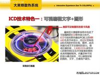 ????泡泡網(wǎng)顯卡頻道11月22日?ICD可視編程在散熱器上實時顯示文字和圖形的顯卡散熱器,可以說是顯卡散熱領(lǐng)域的一大創(chuàng)舉,七彩虹首次將這一技術(shù)帶入了顯卡散熱器。通過ICD這一技術(shù),可以定制屬于自己的文字和圖形,展現(xiàn)自我個性(每行可設(shè)最多16個字符,一共8行,可顯示最多128個字符),相信追求個性時尚的朋友有些心動了。小編從“游戲顯卡專家”七彩虹CCDL研發(fā)中心獲悉,采用這一技術(shù)的顯卡將于近期面市