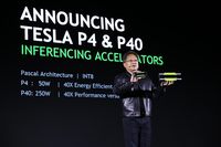 ????NVIDIA 今天宣布,旗下基于 Pascal? 架構的深度學習平臺再添新成員:新款 NVIDIA? Tesla? P4 和 P40 GPU 加速器及新軟件帶來大幅飆升的效率和速度,能更快速地處理人工智能服務的推理工作負載。NVIDIA聯(lián)合創(chuàng)始人、總裁兼首席執(zhí)行官黃仁勛先生向大家介紹新款Tesla P4和P40加速器????語音激活的幫助、垃圾郵件過濾器以及電影和產(chǎn)品推薦引擎等現(xiàn)代 AI