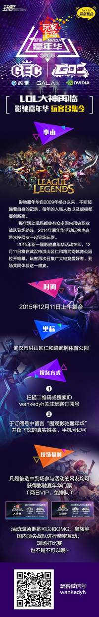 ??? 2015年新一屆影馳嘉年華活動在即,12月11日將在武漢市洪山區(qū)仁和路武鋼體育公園拉開帷幕,玩客再次召集廣大電競愛好者,到場共同體驗(yàn)這一盛宴。凡是被選中到場參與活動的網(wǎng)友均可獲得影馳嘉年華門票(兩日VIP,免排隊),活動現(xiàn)場更是可以和OMG、皇族等國內(nèi)頂尖戰(zhàn)隊進(jìn)行親密互動,同臺競技也不是不可以哦~??? Ps.本次活動招募僅面向武漢本地網(wǎng)友,望見諒。??? 《玩客》和好玩的人,玩兒好產(chǎn)品?