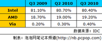 ????泡泡網(wǎng)筆記本頻道11月12日?據(jù)國(guó)外媒體報(bào)道,IDC周三發(fā)布的調(diào)查報(bào)告顯示,今年第三季度,AMD和威盛的全球處理器市場(chǎng)份額均有所提升,而英特爾則略微下滑。IDC數(shù)據(jù)顯示,今年第三季度,AMD全球處理器市場(chǎng)份額為19.2%,高于今年第二季度的19%。而威盛的市場(chǎng)份額也從今年第二季度的0.3%增至0.4%。 ??? 相比之下,英特爾市場(chǎng)份額則有所下滑,從第二季度的80.7%降至80.4%