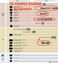 ????泡泡網(wǎng)數(shù)碼相機頻道2月9日?本周四2月12日就是一年一度的日本2015CP+影像大展。外媒傳來消息稱富士有可能在CP+上展出最新XF微單鏡頭以及2015年將要發(fā)布的最新鏡頭路線圖。??? 從上圖我們可以看到,有可能展出的包括一支120mm f2.8 Macro微距長焦(等效全幅焦距為180mm),新版35mm f2(等效全幅焦距為50mm,標頭一支),100-400mm超長焦(等效全幅為1