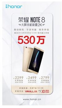 ????2016年8月9日10:08,榮耀NOTE8正式在華為商城和京東商城同步開(kāi)啟發(fā)售,8月1日榮耀NOTE8正式發(fā)布,當(dāng)天就可在華為商城和京東商城預(yù)約購(gòu)機(jī)。值得一提的是,在剛剛過(guò)去的預(yù)約期間,截止到8月8日12:00,預(yù)約總量已超過(guò)530萬(wàn)臺(tái),主打“大屏手機(jī)就要2K”的榮耀NOTE8的熱度可見(jiàn)一斑。????榮耀NOTE8全系均為雙卡雙待的全網(wǎng)通手機(jī),同時(shí)配備6.6英寸2K Super AMOL
