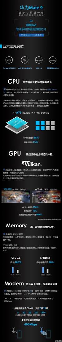 華為消費(fèi)者業(yè)務(wù)CEO余承東剛剛分享了一張圖了解Mate 9麒麟960性能,認(rèn)為后者是一款專注手機(jī)體驗(yàn)的旗艦芯片?! ∪A為稱,麒麟960擁有4大突破,分別是Cortex-A73 CPU、Mali G71八核GPU、UFS2.1閃存和自研全模Modem?! ∑渲蠥73大核的主頻是2.4GHz,A53小核是1.8GHz,CPU性能提升18%、能效比提升15%,華為舉例,比如開(kāi)導(dǎo)航時(shí),就會(huì)啟用一個(gè)大核