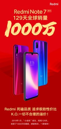 今年1月10日,小米集團宣布將紅米手機戰(zhàn)略升級為Redmi品牌獨立運營,Redmi將死磕高品質(zhì)、追求極致性價比。Redmi品牌獨立當(dāng)日即發(fā)布首款產(chǎn)品Redmi Note 7,隨后在3月18日發(fā)布了第二款產(chǎn)品Note 7 Pro。Redmi Note7系列產(chǎn)品發(fā)布后,銷售持續(xù)火爆,發(fā)售29天中國區(qū)銷量破100萬臺、從100萬臺到400萬臺用時45天。截止5月23日,僅用時129天,4個月時間Redmi Note 7系列全球銷量即正式突破1000萬臺。