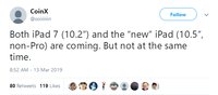 據爆料大神CoinX稱,蘋果將推出10.2英寸的第七代iPad和全新10.5英寸的iPad,并且兩款iPad估計不會同時發(fā)布。10.5英寸iPad可能是簡配版的iPad Pro,兩款預計價格位于329-799美元之間。