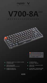 領(lǐng)軍國產(chǎn)外設(shè)品牌,實(shí)力大廠上市企業(yè)Rapoo雷柏發(fā)布的V700-8A多模式有線無線背光游戲機(jī)械鍵盤。擁有機(jī)甲紫,孤勇者,無人區(qū)三款配色,75%配列84鍵的緊湊型鍵位布局,藍(lán)牙5.0、藍(lán)牙3.0、無線2.4G和有線四種模式,最多支持5臺(tái)設(shè)備連接切換,雷柏自主黑青茶紅游戲軸體,實(shí)現(xiàn)有線全鍵無沖,無線任意6鍵無沖,內(nèi)置4000mAh的鋰電池,支持邊充邊使用,全鍵可編程,超強(qiáng)的驅(qū)動(dòng)軟件也讓鍵盤的可玩性獲得更大的提高,售價(jià)僅為299元,相信它一定會(huì)成為你的游戲利器,給你暢快的游戲操作體驗(yàn)。